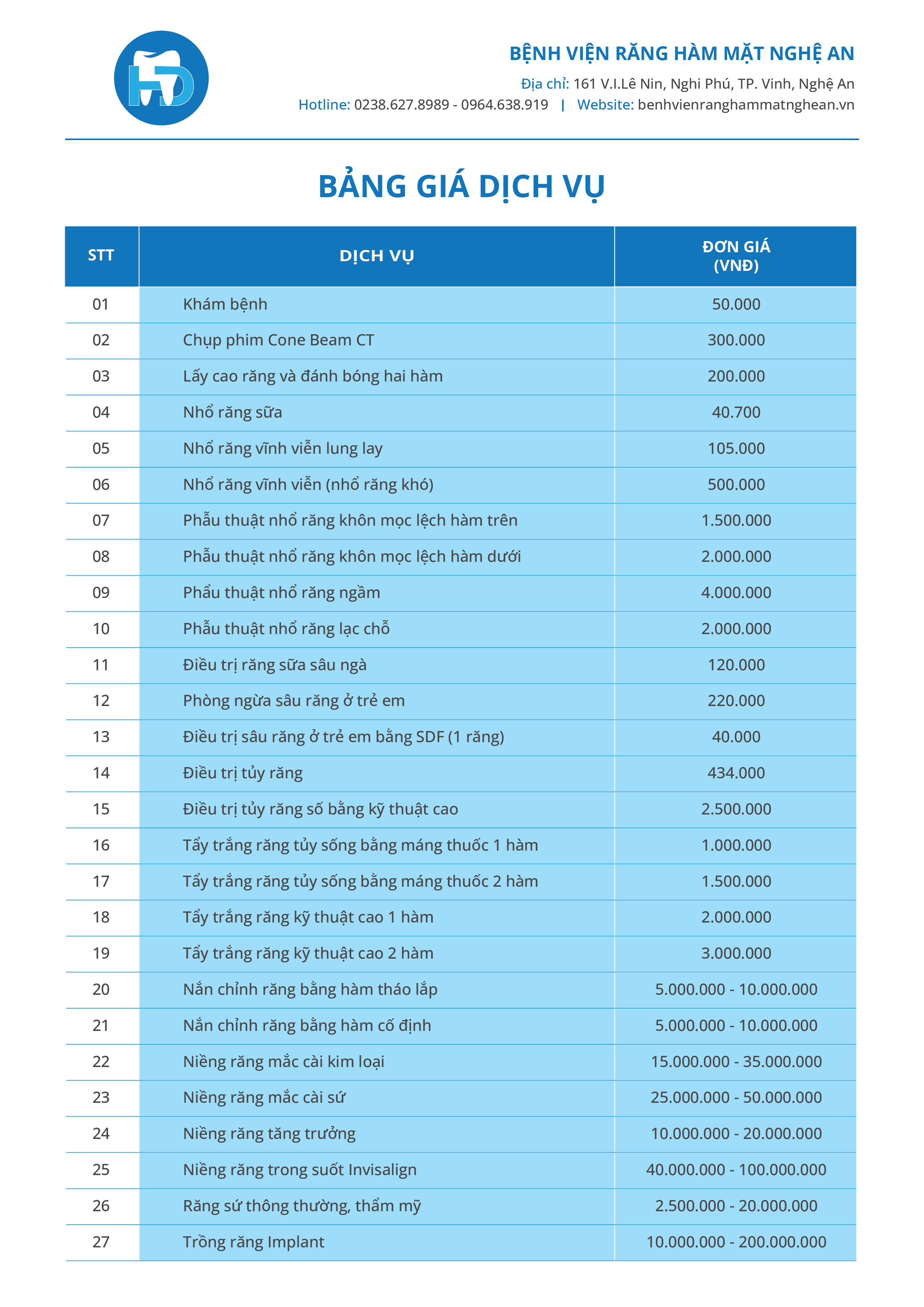 Bảng giá các dịch vụ tại Bệnh viện Răng Hàm Mặt Nghệ An